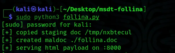 sudo python3 follina.pyto create a payload follina.doc and serve it on port 8000. This will enable you to download the doc file on the victim machine.